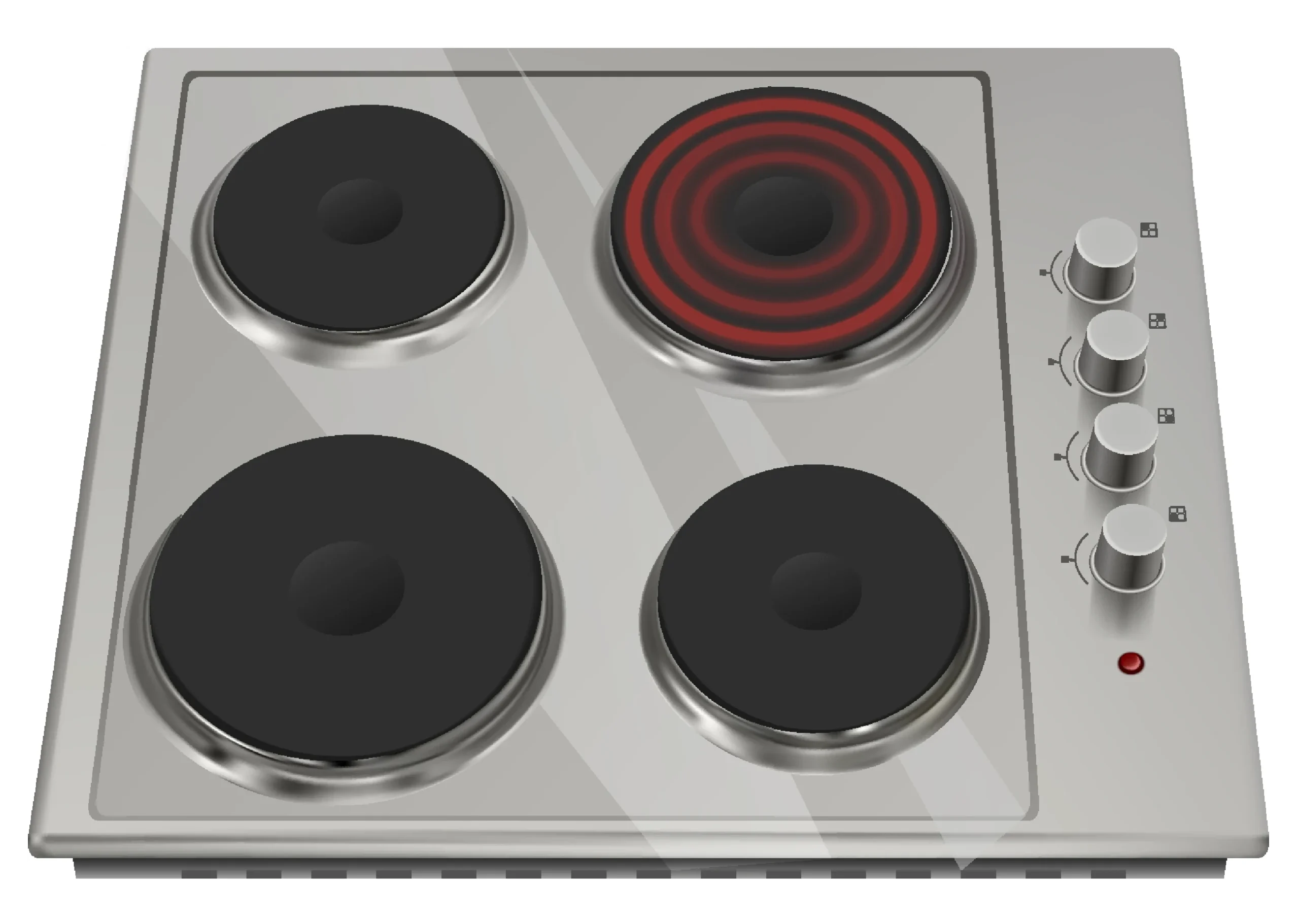 O fogão elétrico utiliza resistências internas para aquecer placas metálicas ou vitrocerâmicas.
